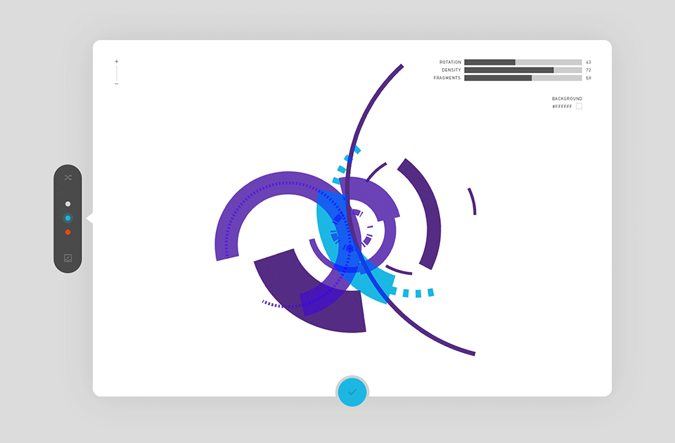 The application enabled the client to create and export randomly generated compositions based on the positioning, colour, depth and pattern guidelines of the visual langauge.